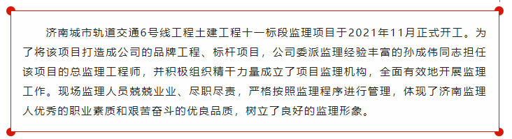 公司獲評(píng)濟(jì)南軌道交通集團(tuán)建設(shè)投資有限公司2021年度“優(yōu)秀監(jiān)理單位”