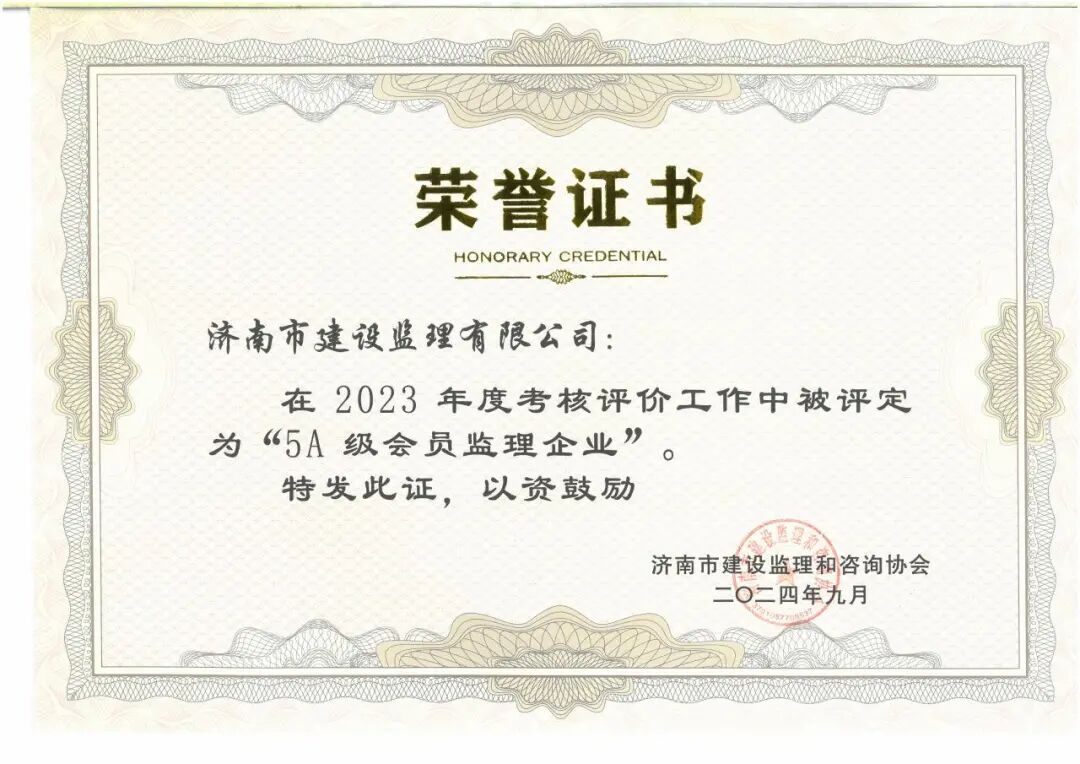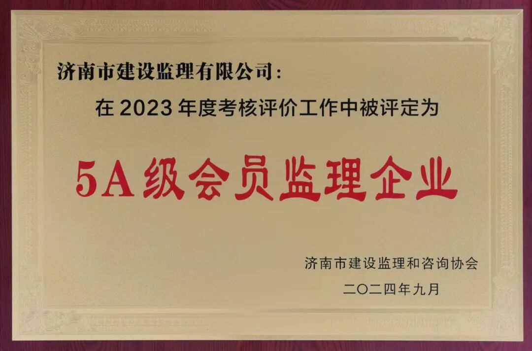 濟(jì)南市建設(shè)監(jiān)理和咨詢協(xié)會公布了2023年度監(jiān)理企業(yè)和從業(yè)人員考核評價(jià)結(jié)果,濟(jì)南監(jiān)理榮獲“2023年度5A級會員監(jiān)理企業(yè)”,陳志翔等17名同志分別榮獲“5A級總監(jiān)理工程師”、“5A級專業(yè)監(jiān)理工程師”和“5A級監(jiān)理員”。