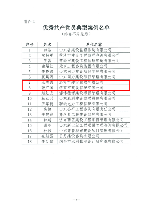 近日,山東省建設(shè)監(jiān)理與咨詢協(xié)會(huì)發(fā)布會(huì)員企業(yè)優(yōu)秀黨建成果及優(yōu)秀黨員典型案例通報(bào),我公司企業(yè)黨建成果獲評“優(yōu)秀企業(yè)黨建成果”、共產(chǎn)黨員王志強(qiáng)、張廣國的先進(jìn)事跡獲評“優(yōu)秀黨員典型案例”。